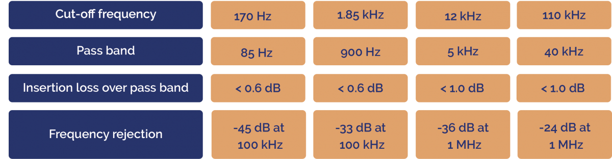 カットオフ周波数は170 Hzから110 kHzの間で4種類から選択できます。