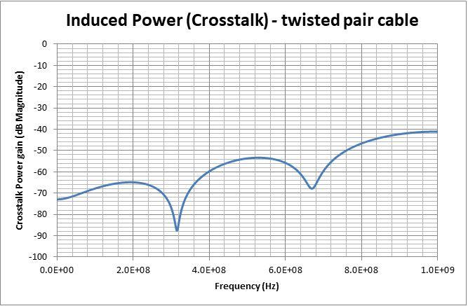 同じケーブル構造の別のツイストペアの導体に励磁駆動電流を流した結果、ツイストペアの一方の導体に誘導されるクロストーク信号を周波数の関数としてプロットしたもの。 各ペアはシールドされ、シールドは機器のグランドに接地されています: